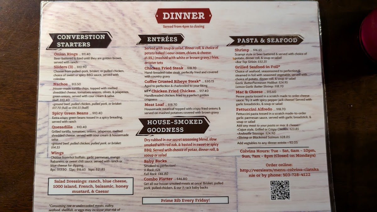 Welcome to Colvins Pub & Grill, a gem in Clatskanie, Oregon, where hearty comfort food meets a friendly atmosphere. Situated at 135 N Nehalem St, this pub offers a diverse menu perfect for any meal of the day. Their house-smoked goodness shines with dishes like the tender Baby Back Ribs and the enticing Combo Platter, ideal for those who crave variety.